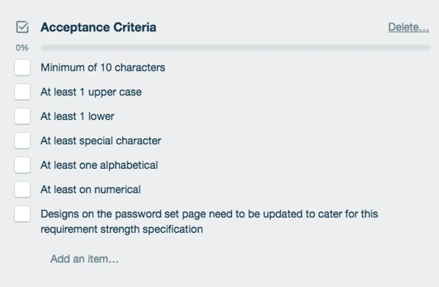 Here’s an example of a set of acceptance criteria – the criteria here relate to the AAC user story which we looked at above, ‘As a member, I want to create a password on my account, so that I can login’.